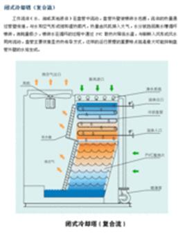 1、閉式冷卻塔實際上是一種蒸發(fā)式冷卻塔,冷卻器和濕式冷卻塔的組合,它是臥式的蒸發(fā)式冷卻塔,工藝流體在管內流過,空氣 在管外流過,兩者互不接觸。閉式冷卻塔是傳統(tǒng)冷卻塔的一種變形和發(fā)展。塔底蓄水池內的水由循環(huán)泵抽取后,送往管外均勻地噴淋下來。與工藝式流體熱水或制冷劑和管外空氣并不接觸,成為一種閉式冷卻塔,通過噴淋水增強傳熱傳質的效果。